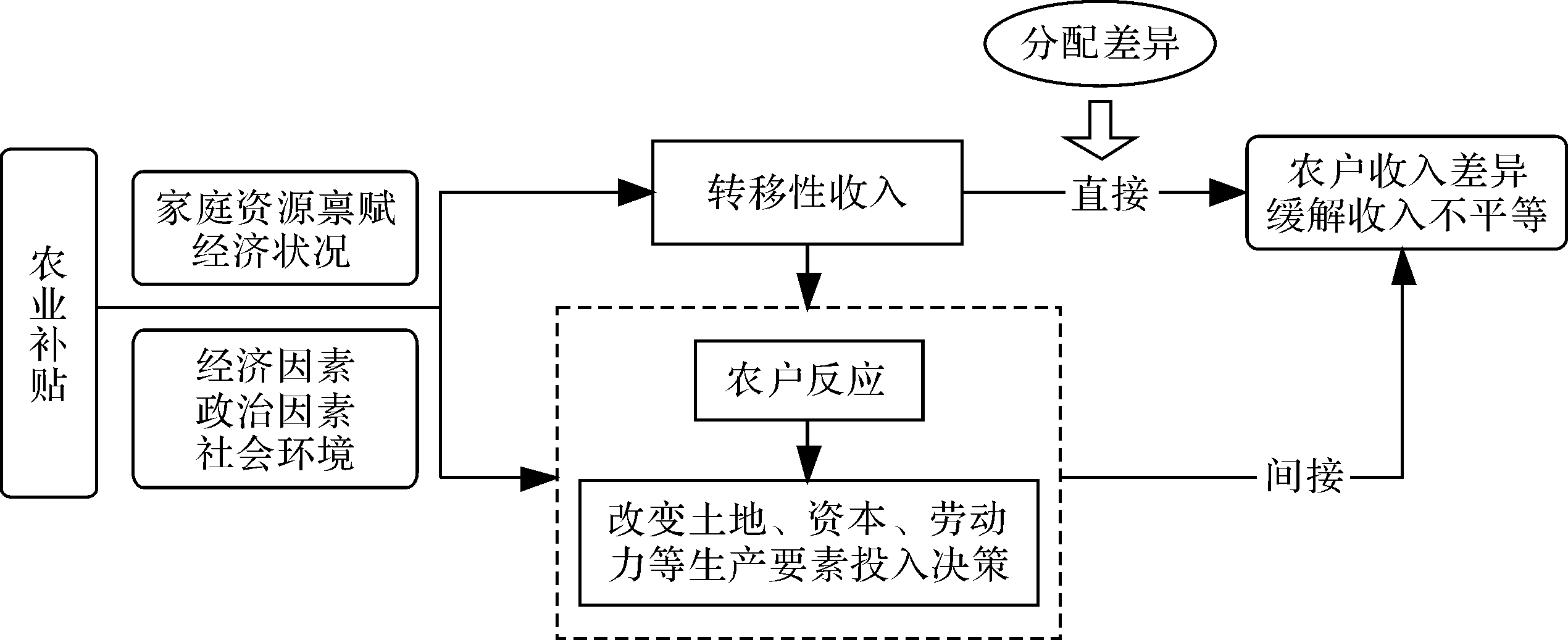 综上所述,在理论层面,农业补贴会通过直接的转移性收入分配差异,以及影响农户物质资本、土地、劳动力等要素投入决策间接地对农户收入产生异质性影响,同时可以缓解农户收入不平等,作用机制如图1所示。