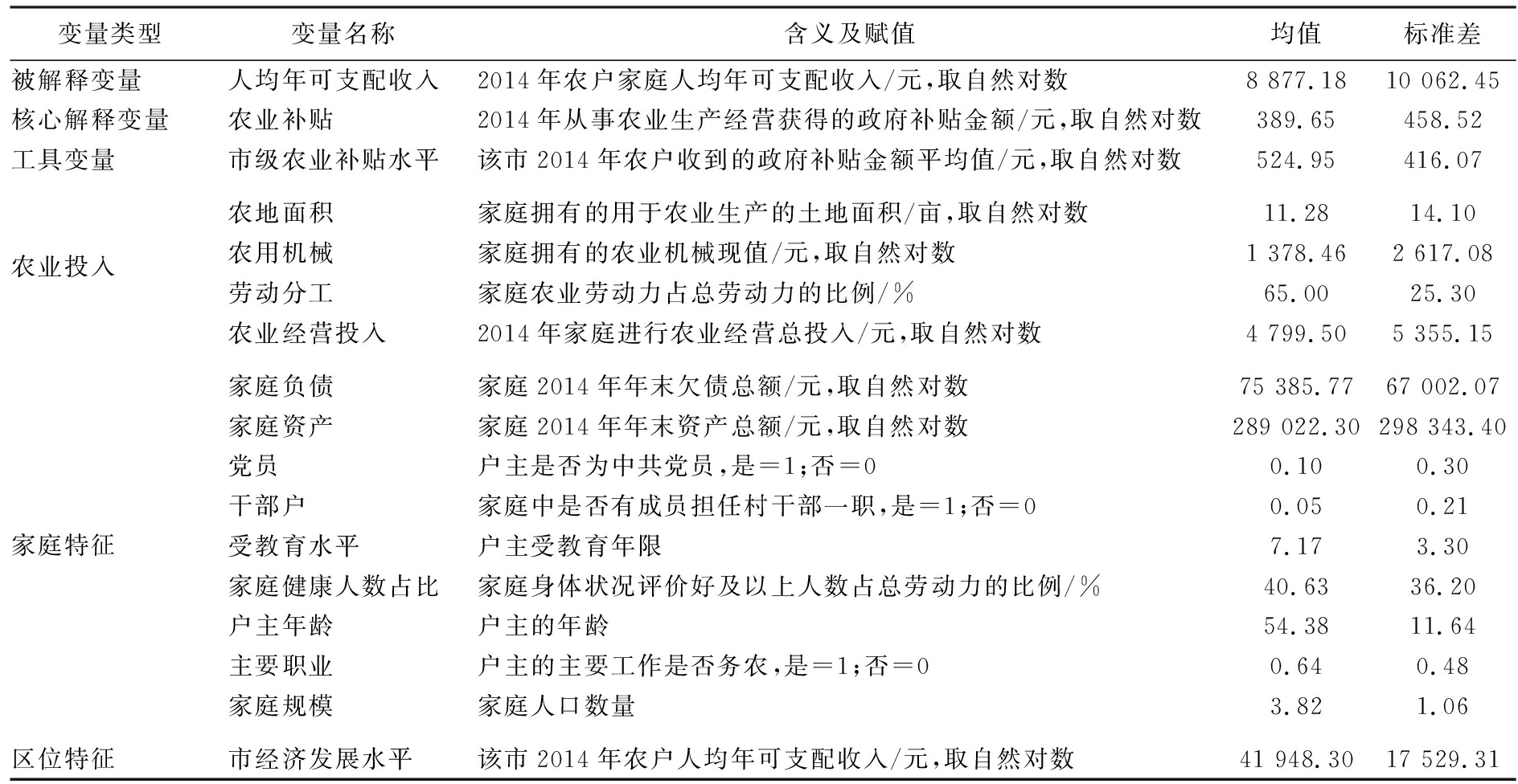 本文选取农户家庭人均年可支配收入为被解释变量。本文的核心解释变量是家庭收到的农业补贴金额,采用“您家从事农业生产经营获得的政府补贴金额共有多少元”进行测度。由于影响农户收入水平的因素多元而复杂[43],本文的控制变量主要包括:(1)农业投入,土地是农户进行生产经营的载体,除此之外,其他的要素投入也会影响和约束农户家庭经营,因此,本文选取农户的农地面积、农业机械现值、劳动分工和家庭农业经营投入来衡量农户家庭农业投入情况。(2)家庭特征,主要包括家庭负债、家庭资产、党员、干部户、受教育水平、家庭健康人数占比、户主年龄、主要职业和家庭规模。其中,选取家庭负债和家庭资产来衡量家庭金融资产状况,原因是考虑到资产流动性约束对农户收入的影响;社会资本、人力资本等对农户收入的影响是被广泛认可的,本文选取是否党员和是否干部户作为衡量社会资本的指标,选取户主受教育年限和家庭健康人数占比作为衡量人力资本的指标;同时控制了其他影响农户收入的变量。(3)区位特征,为了控制区域经济发展差异对农户收入的影响,选取了市经济发展水平变量,用该市农户人均年可支配收入度量。