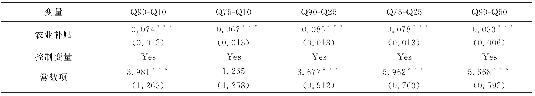 由表5的检验结果发现,在Q90-Q10、Q75-Q10、Q90-25、Q75-Q25和Q90-Q50五组结果中,农业补贴的系数均在1%的显著性水平上显著为负,说明农业补贴可以显著缓解不同收入层次农户收入不平等,H2得到验证,与钟甫宁等[14]基于洛伦兹曲线得到的研究结果一致。