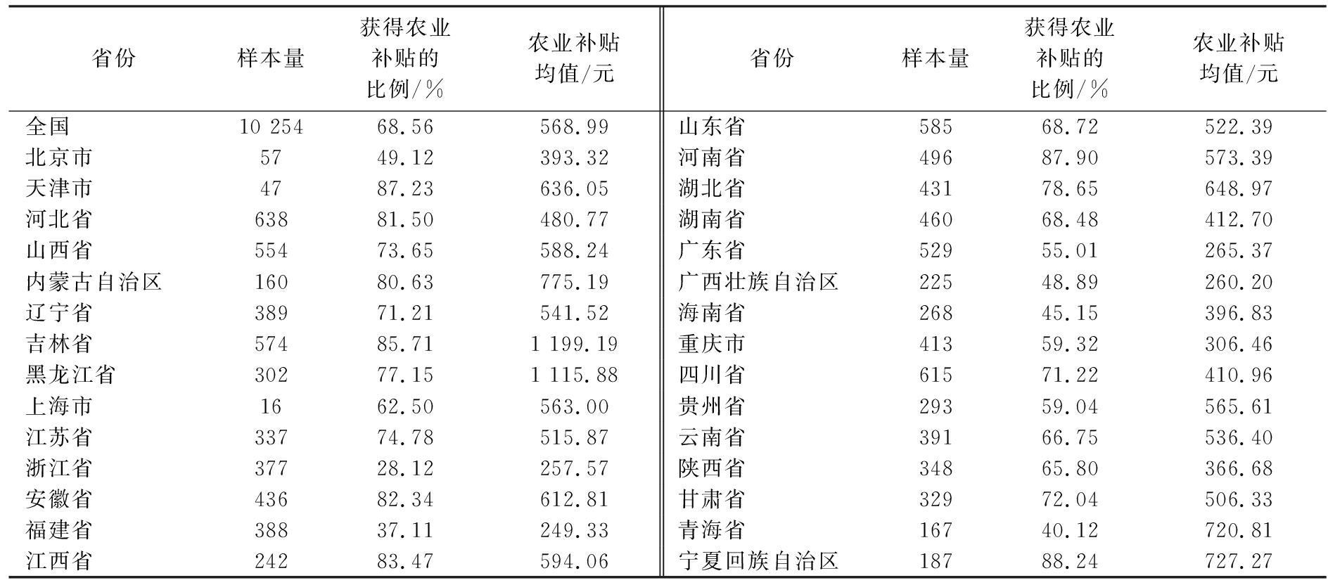 注:农业补贴比例为该省份获得农业补贴的家庭占总家庭数的比例;农业补贴均值为该省份获得农业补贴的家庭的平均值。