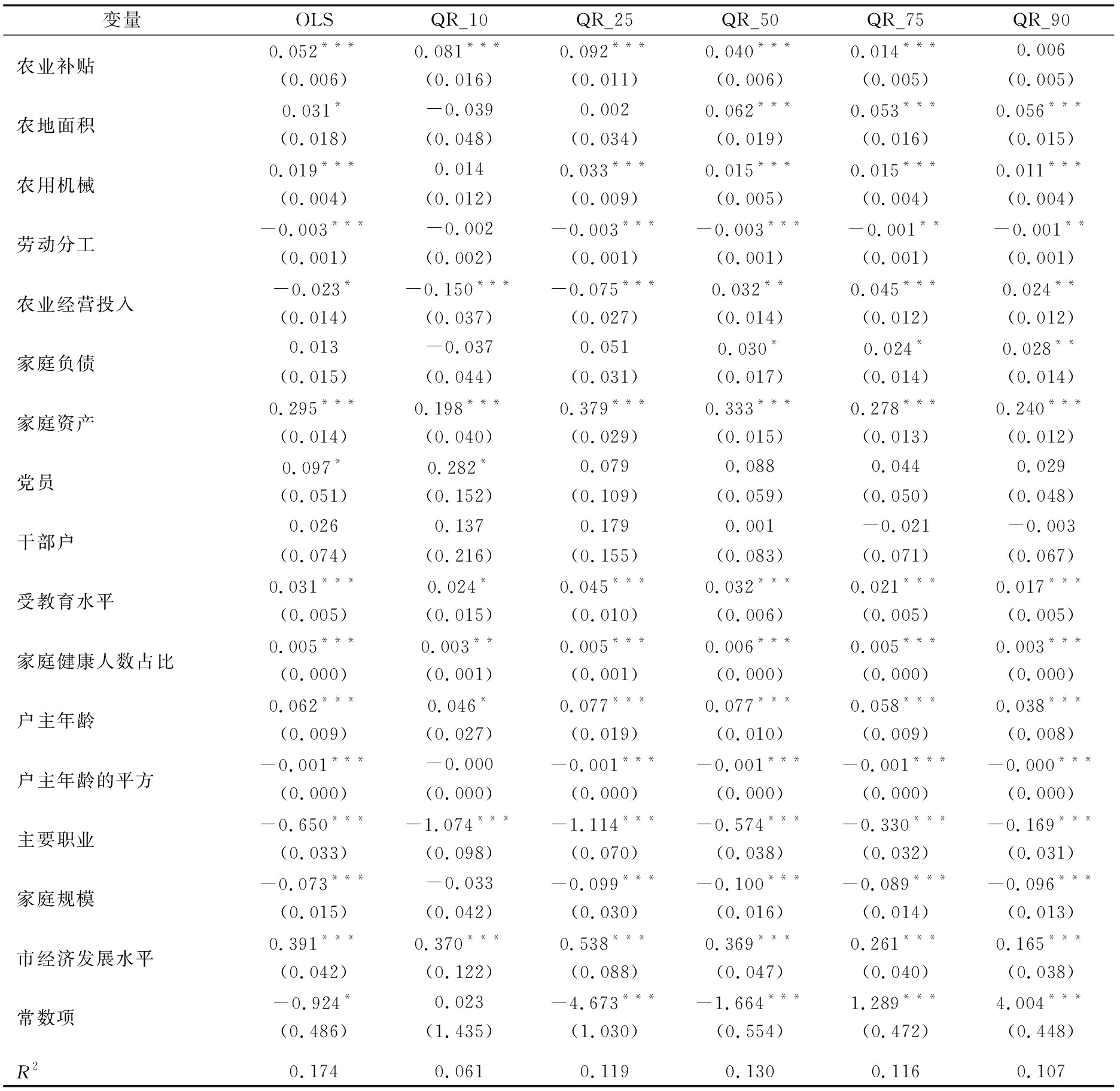 变量OLSQR_10QR_25QR_50QR_75QR_90农业补贴0.052***0.081***0.092***0.040***0.014***0.006(0.006)(0.016)(0.011)(0.006)(0.005)(0.005)农地面积0.031*-0.0390.0020.062***0.053***0.056***(0.018)(0.048)(0.034)(0.019)(0.016)(0.015)农用机械0.019***0.0140.033***0.015***0.015***0.011***(0.004)(0.012)(0.009)(0.005)(0.004)(0.004)劳动分工-0.003***-0.002-0.003***-0.003***-0.001**-0.001**(0.001)(0.002)(0.001)(0.001)(0.001)(0.001)农业经营投入-0.023*-0.150***-0.075***0.032**0.045***0.024**(0.014)(0.037)(0.027)(0.014)(0.012)(0.012)家庭负债0.013-0.0370.0510.030*0.024*0.028**(0.015)(0.044)(0.031)(0.017)(0.014)(0.014)家庭资产0.295***0.198***0.379***0.333***0.278***0.240***(0.014)(0.040)(0.029)(0.015)(0.013)(0.012)党员0.097*0.282*0.0790.0880.0440.029(0.051)(0.152)(0.109)(0.059)(0.050)(0.048)干部户0.0260.1370.1790.001-0.021-0.003(0.074)(0.216)(0.155)(0.083)(0.071)(0.067)受教育水平0.031***0.024*0.045***0.032***0.021***0.017***(0.005)(0.015)(0.010)(0.006)(0.005)(0.005)家庭健康人数占比0.005***0.003**0.005***0.006***0.005***0.003***(0.000)(0.001)(0.001)(0.000)(0.000)(0.000)户主年龄0.062***0.046*0.077***0.077***0.058***0.038***(0.009)(0.027)(0.019)(0.010)(0.009)(0.008)户主年龄的平方-0.001***-0.000-0.001***-0.001***-0.001***-0.000***(0.000)(0.000)(0.000)(0.000)(0.000)(0.000)主要职业-0.650***-1.074***-1.114***-0.574***-0.330***-0.169***(0.033)(0.098)(0.070)(0.038)(0.032)(0.031)家庭规模-0.073***-0.033-0.099***-0.100***-0.089***-0.096***(0.015)(0.042)(0.030)(0.016)(0.014)(0.013)市经济发展水平0.391***0.370***0.538***0.369***0.261***0.165***(0.042)(0.122)(0.088)(0.047)(0.040)(0.038)常数项-0.924*0.023-4.673***-1.664***1.289***4.004***(0.486)(1.435)(1.030)(0.554)(0.472)(0.448)R20.1740.0610.1190.1300.1160.107