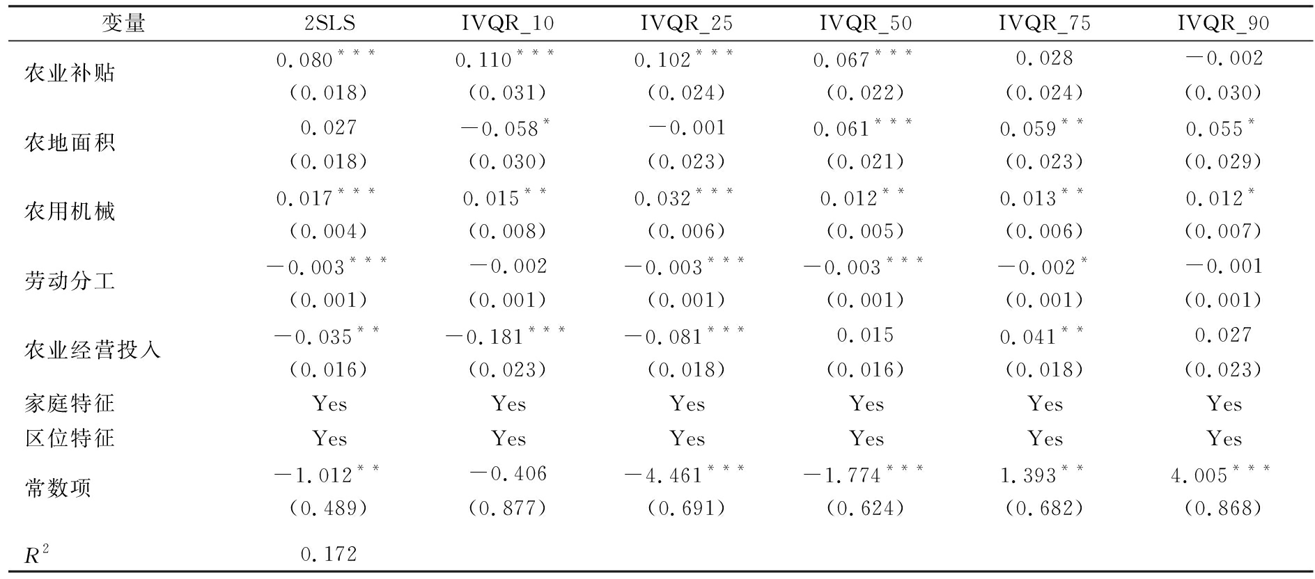 工具变量分位数结果表明,农业补贴对不同收入层次的农户家庭人均年可支配收入的影响存在差异。在0.10、0.25、0.50分位点上的系数显著为正,说明农业补贴对最低收入组、中低收入组和中等收入组农户家庭人均年可支配收入增加具有显著的促进作用。对于中高收入组农户,农业补贴对农户家庭人均年可支配收入具有正向影响,但是在统计意义上不显著。对于最高收入组农户,农业补贴对农户家庭人均年可支配收入具有负向影响,也不显著。总的来说,农业补贴对高收入组农户家庭人均年可支配收入的作用不显著。普通分位数回归和工具变量分位数回归相比,其在各分位点上系数符号基本相同,说明了本文实证结果的可靠性,即农业补贴会显著促进低收入组和中等收入组农户家庭人均年可支配收入提高,而对高收入组农户家庭人均年可支配收入的作用不显著,进一步验证了假说H1。