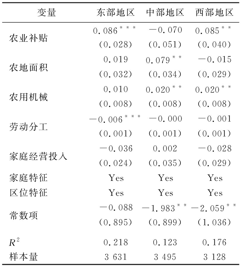 变量东部地区中部地区西部地区农业补贴0.086***-0.0700.085**(0.028)(0.051)(0.040)农地面积0.0190.079**-0.015(0.032)(0.034)(0.029)农用机械0.0100.020**0.020**(0.008)(0.008)(0.008)劳动分工-0.006***-0.000-0.001(0.001)(0.001)(0.001)家庭经营投入-0.0360.002-0.028(0.024)(0.035)(0.029)家庭特征YesYesYes区位特征YesYesYes常数项-0.088-1.983**-2.059**(0.895)(0.899)(1.036)R20.2180.1230.176样本量3 6313 4953 128