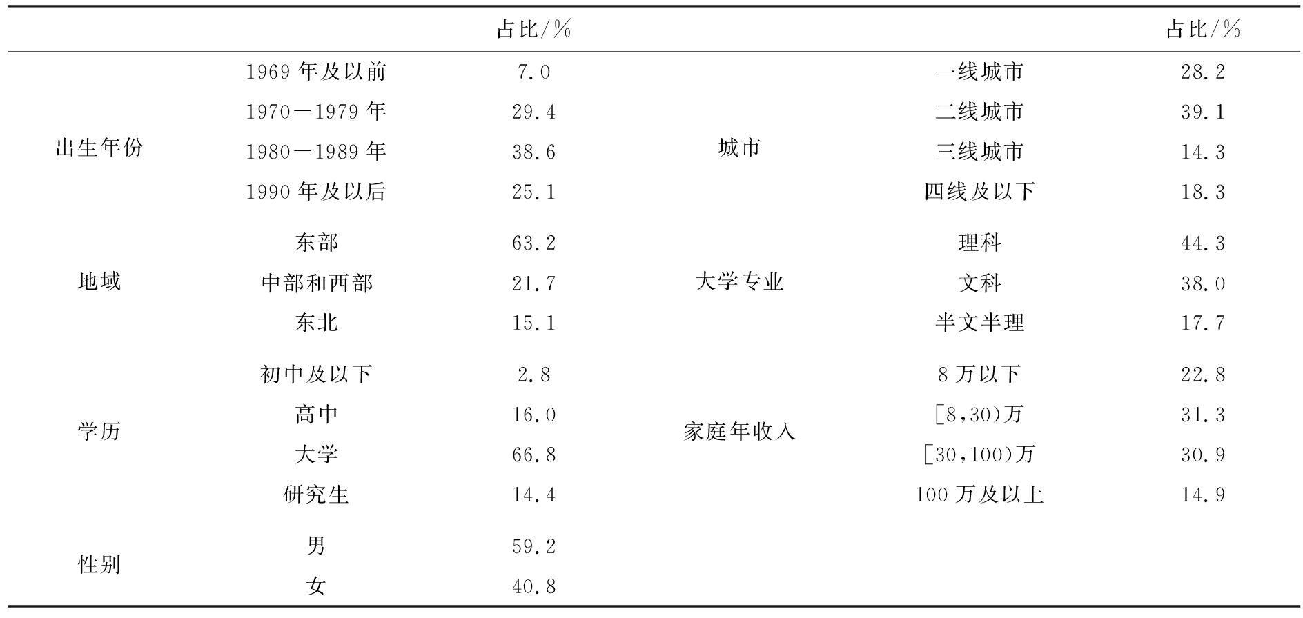 占比/%占比/%出生年份1969年及以前7.0城市一线城市28.21970-1979年29.4二线城市39.11980-1989年38.6三线城市14.31990年及以后25.1四线及以下18.3地域东部63.2大学专业理科44.3中部和西部21.7文科38.0东北15.1半文半理17.7学历初中及以下2.8家庭年收入8万以下22.8高中16.0[8,30)万31.3大学66.8[30,100)万30.9研究生14.4100万及以上14.9性别男59.2女40.8