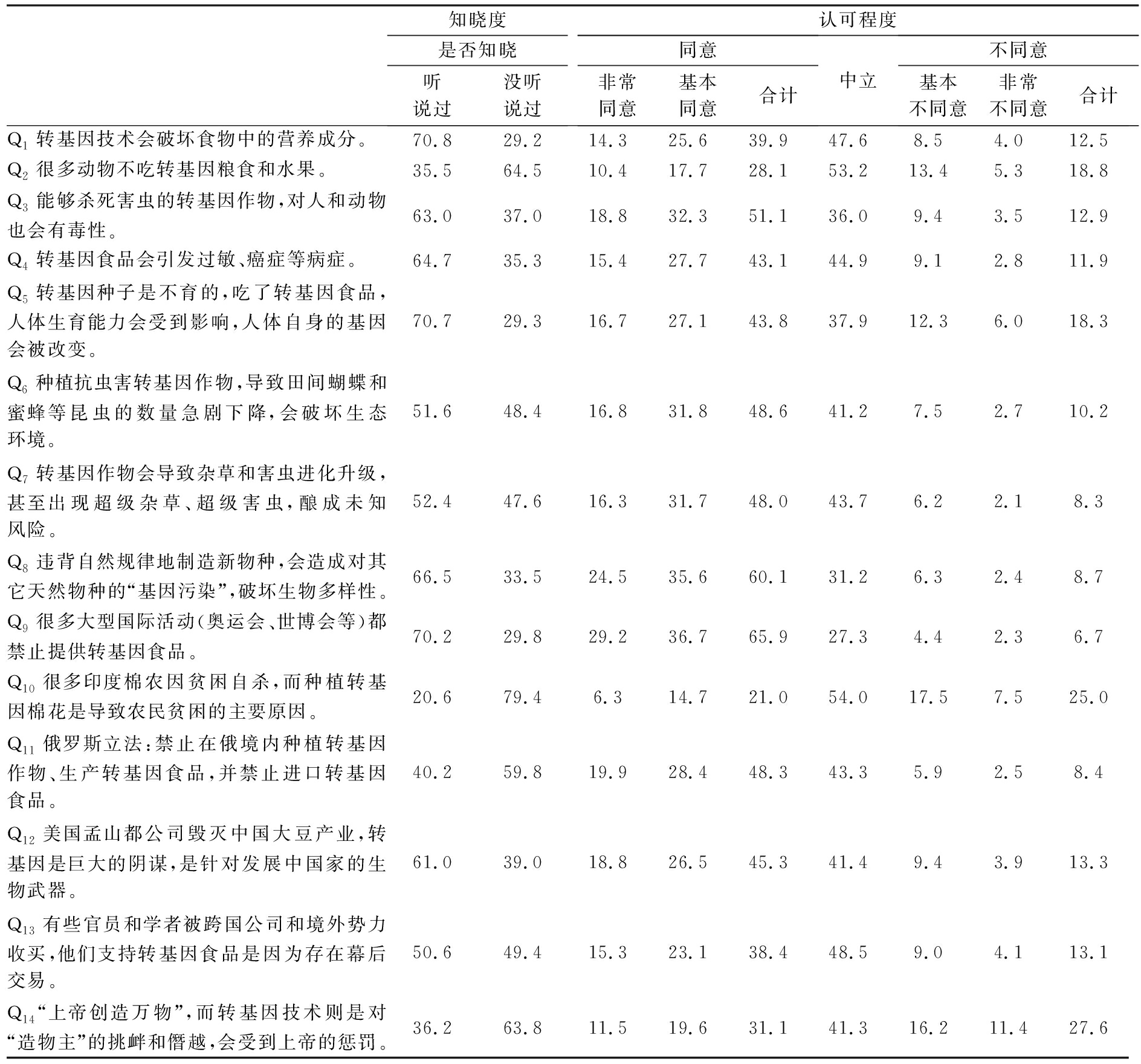 表4 中国公众对转基因负面传言的知晓度和认可度 %