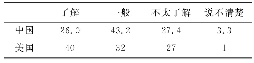 宾夕法尼亚大学在美国的电话调查样本数量为1 008份。由于电话沟通时间受限,美国的调查样本缺少详尽的人口特征数据。需要说明的是,这次随机电话调查覆盖了美国的50个州,而本研究问卷调查则覆盖了中国内地的29个省份,所以这次平行调查的结果仍具有一定的参考价值。统计结果显示如表2,中国公众自认为了解转基因的仅为26%,明显低于美国的40%。