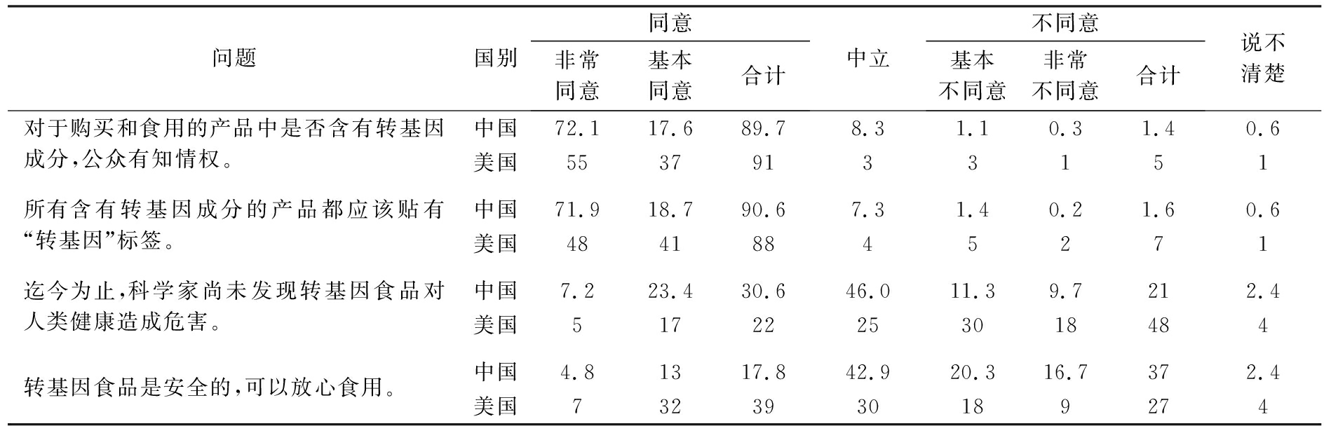 问题国别同意非常同意基本同意合计中立不同意基本不同意非常不同意合计说不清楚对于购买和食用的产品中是否含有转基因成分,公众有知情权。中国72.1 17.6 89.7 8.3 1.1 0.3 1.4 0.6 美国55 37 91 3 3 1 5 1 所有含有转基因成分的产品都应该贴有“转基因”标签。 中国71.9 18.7 90.6 7.3 1.4 0.2 1.6 0.6 美国48 41 88 4 5 2 7 1 迄今为止,科学家尚未发现转基因食品对人类健康造成危害。中国7.2 23.4 30.6 46.0 11.3 9.7 21 2.4 美国5 17 22 25 30 18 48 4 转基因食品是安全的,可以放心食用。 中国4.8 13 17.8 42.9 20.3 16.7 37 2.4 美国7 32 39 30 18 9 27 4