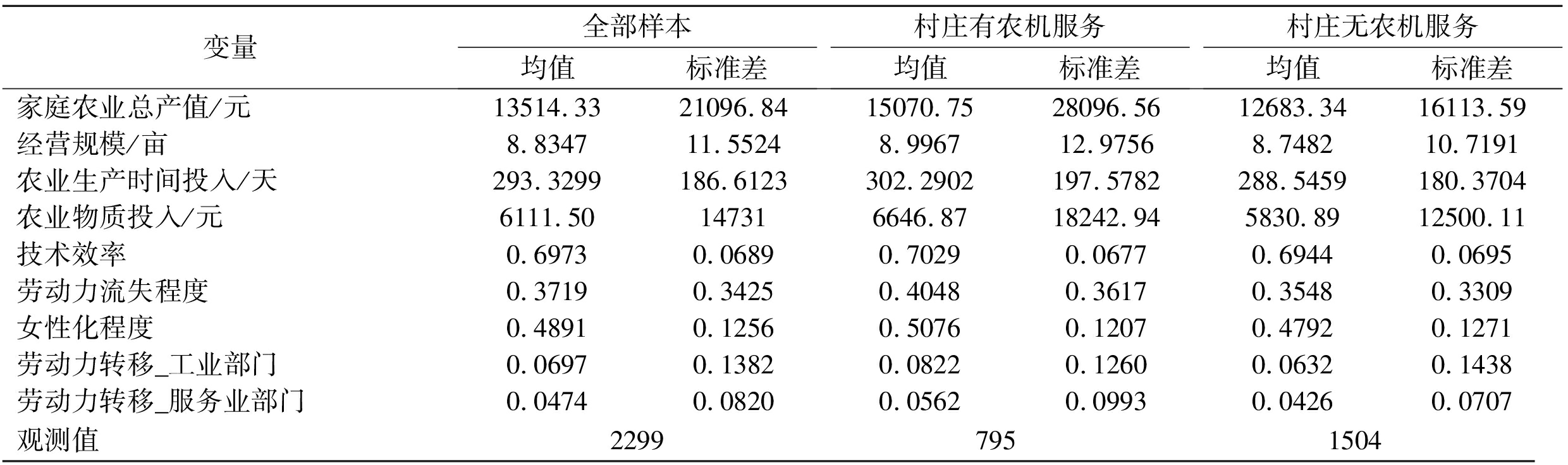 变量的选择、定义和赋值见表1,具体包括投入与产出变量,被解释变量、核心自变量与中介变量、控制变量四类。本研究关注的核心解释变量为农机服务和农村劳动力结构变化,前者以村庄是否可以享受机耕服务作为代理变量,后者主要以劳动力流失(城乡结构)、女性化程度(性别结构)、工业和服务业劳动力比例(产业结构)4个指标衡量。