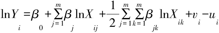 (1)SFA。随机前沿分析(stochastic frontier analysis,SFA),是由Aigner 等和Meeusen等分别独立提出的、利用随机前沿生产函数进行效率估计的参数方法[37-38]。首先,运用SFA方法估计每户农户的粮食生产技术效率。由于超越对数生产函数的设定形式较为灵活,无须限定各要素替代弹性完全相同或者要素替代弹性之和为1,并且允许粮食生产投入与产出之间存在非线性关系。借鉴Beattie 等,Battese等研究[39-40],将农户粮食生产的超越对数随机前沿生产函数设置为: