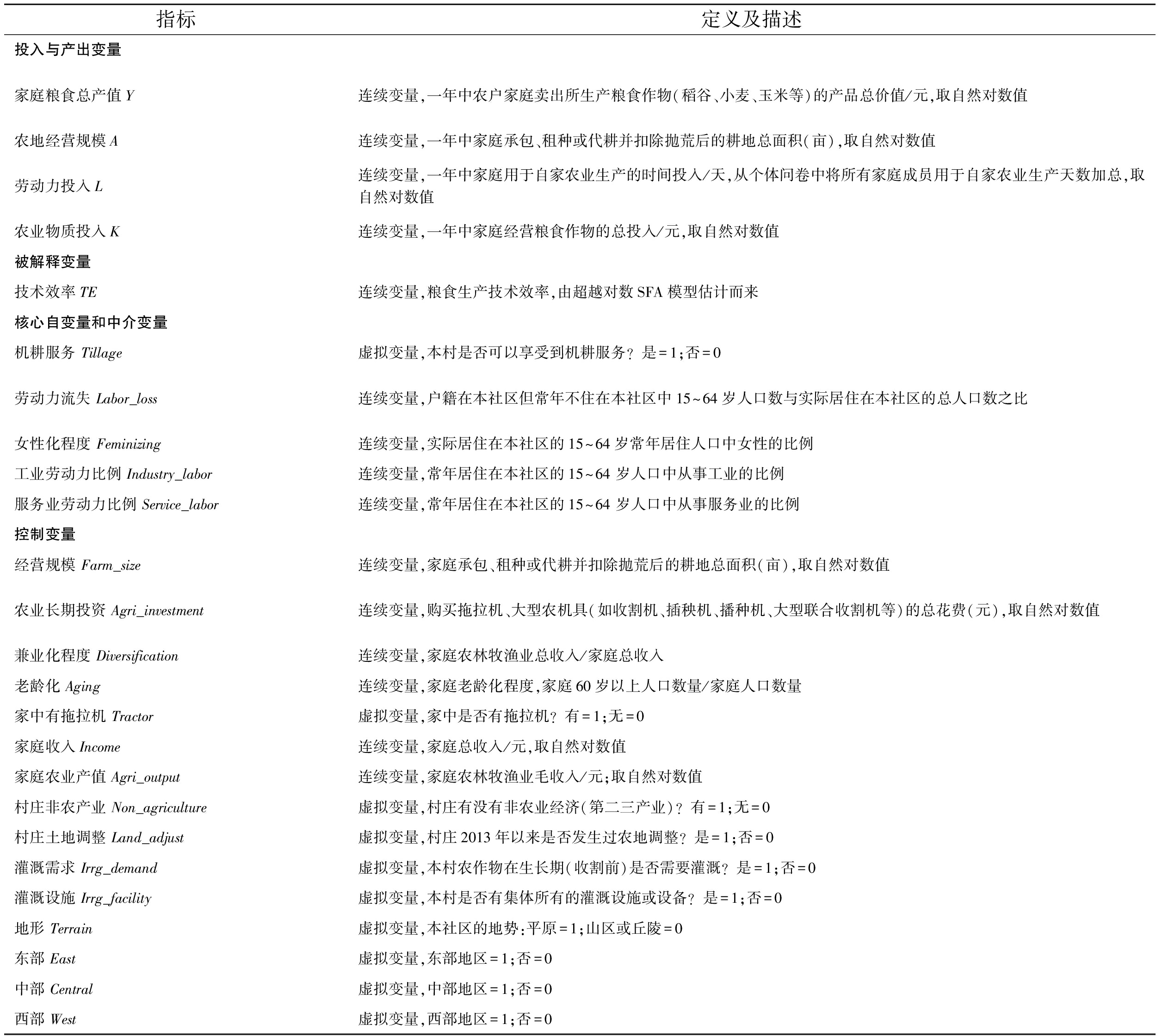指标定义及描述投入与产出变量家庭粮食总产值Y连续变量,一年中农户家庭卖出所生产粮食作物(稻谷、小麦、玉米等)的产品总价值/元,取自然对数值农地经营规模A连续变量,一年中家庭承包、租种或代耕并扣除抛荒后的耕地总面积(亩),取自然对数值劳动力投入L连续变量,一年中家庭用于自家农业生产的时间投入/天,从个体问卷中将所有家庭成员用于自家农业生产天数加总,取自然对数值农业物质投入K连续变量,一年中家庭经营粮食作物的总投入/元,取自然对数值被解释变量技术效率TE连续变量,粮食生产技术效率,由超越对数SFA模型估计而来核心自变量和中介变量机耕服务 Tillage虚拟变量,本村是否可以享受到机耕服务?是=1;否=0劳动力流失 Labor_loss连续变量,户籍在本社区但常年不住在本社区中15~64岁人口数与实际居住在本社区的总人口数之比女性化程度 Feminizing连续变量,实际居住在本社区的15~64岁常年居住人口中女性的比例工业劳动力比例 Industry_labor连续变量,常年居住在本社区的15~64 岁人口中从事工业的比例服务业劳动力比例 Service_labor连续变量,常年居住在本社区的15~64 岁人口中从事服务业的比例控制变量经营规模 Farm_size连续变量,家庭承包、租种或代耕并扣除抛荒后的耕地总面积(亩),取自然对数值农业长期投资 Agri_investment连续变量,购买拖拉机、大型农机具(如收割机、插秧机、播种机、大型联合收割机等)的总花费(元),取自然对数值兼业化程度 Diversification连续变量,家庭农林牧渔业总收入/家庭总收入老龄化 Aging连续变量,家庭老龄化程度,家庭60岁以上人口数量/家庭人口数量家中有拖拉机 Tractor虚拟变量,家中是否有拖拉机?有=1;无=0家庭收入Income连续变量,家庭总收入/元,取自然对数值家庭农业产值 Agri_output连续变量,家庭农林牧渔业毛收入/元;取自然对数值村庄非农产业 Non_agriculture虚拟变量,村庄有没有非农业经济(第二三产业)?有=1;无=0村庄土地调整 Land_adjust虚拟变量,村庄2013年以来是否发生过农地调整?是=1;否=0灌溉需求 Irrg_demand虚拟变量,本村农作物在生长期(收割前)是否需要灌溉?是=1;否=0灌溉设施 Irrg_facility虚拟变量,本村是否有集体所有的灌溉设施或设备?是=1;否=0地形 Terrain虚拟变量,本社区的地势:平原=1;山区或丘陵=0东部 East虚拟变量,东部地区=1;否=0中部 Central虚拟变量,中部地区=1;否=0西部 West虚拟变量,西部地区=1;否=0