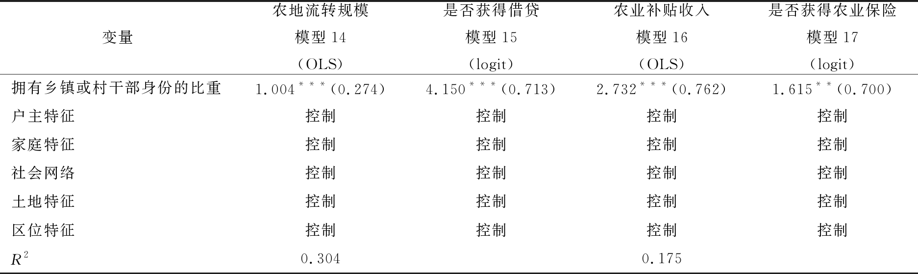 变量农地流转规模模型14(OLS)是否获得借贷模型15(logit)农业补贴收入模型16(OLS)是否获得农业保险模型17(logit)拥有乡镇或村干部身份的比重1.004***(0.274)4.150***(0.713)2.732***(0.762)1.615**(0.700)户主特征控制控制控制控制家庭特征控制控制控制控制社会网络控制控制控制控制土地特征控制控制控制控制区位特征控制控制控制控制R20.3040.175