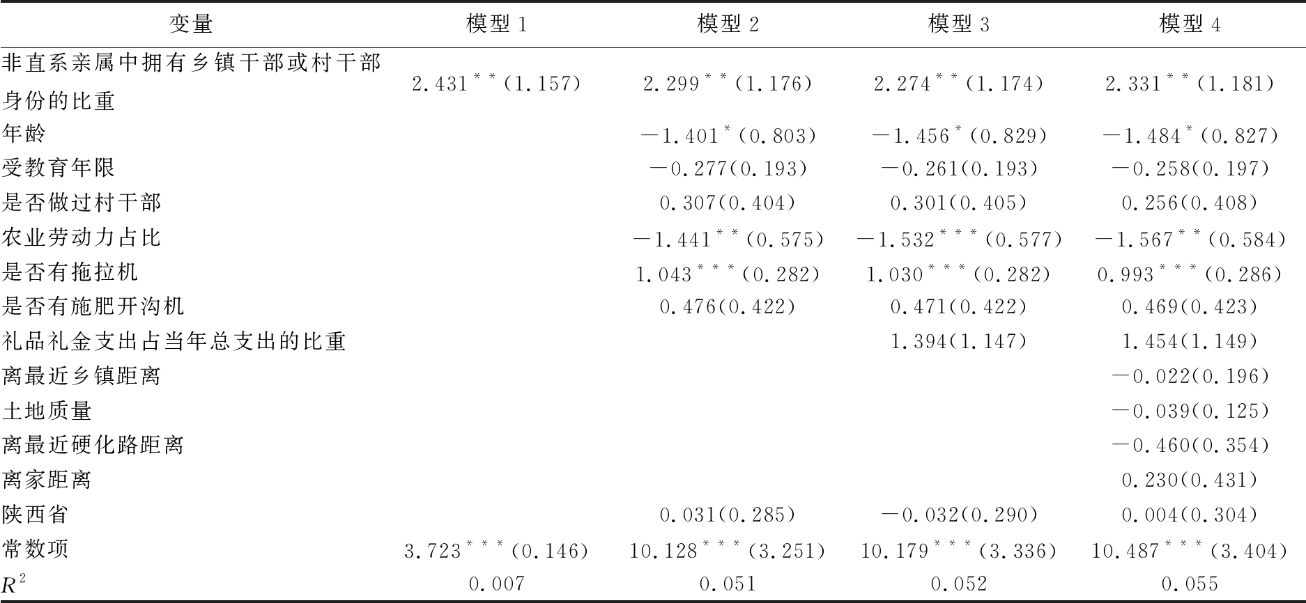 变量模型1模型2模型3模型4非直系亲属中拥有乡镇干部或村干部身份的比重2.431**(1.157)2.299**(1.176)2.274**(1.174)2.331**(1.181)年龄-1.401*(0.803)-1.456*(0.829)-1.484*(0.827)受教育年限-0.277(0.193)-0.261(0.193)-0.258(0.197)是否做过村干部0.307(0.404)0.301(0.405)0.256(0.408)农业劳动力占比-1.441**(0.575)-1.532***(0.577)-1.567**(0.584)是否有拖拉机1.043***(0.282)1.030***(0.282)0.993***(0.286)是否有施肥开沟机0.476(0.422)0.471(0.422)0.469(0.423)礼品礼金支出占当年总支出的比重1.394(1.147)1.454(1.149)离最近乡镇距离-0.022(0.196)土地质量-0.039(0.125)离最近硬化路距离-0.460(0.354)离家距离0.230(0.431)陕西省0.031(0.285)-0.032(0.290)0.004(0.304)常数项3.723***(0.146)10.128***(3.251)10.179***(3.336)10.487***(3.404)R20.0070.0510.0520.055