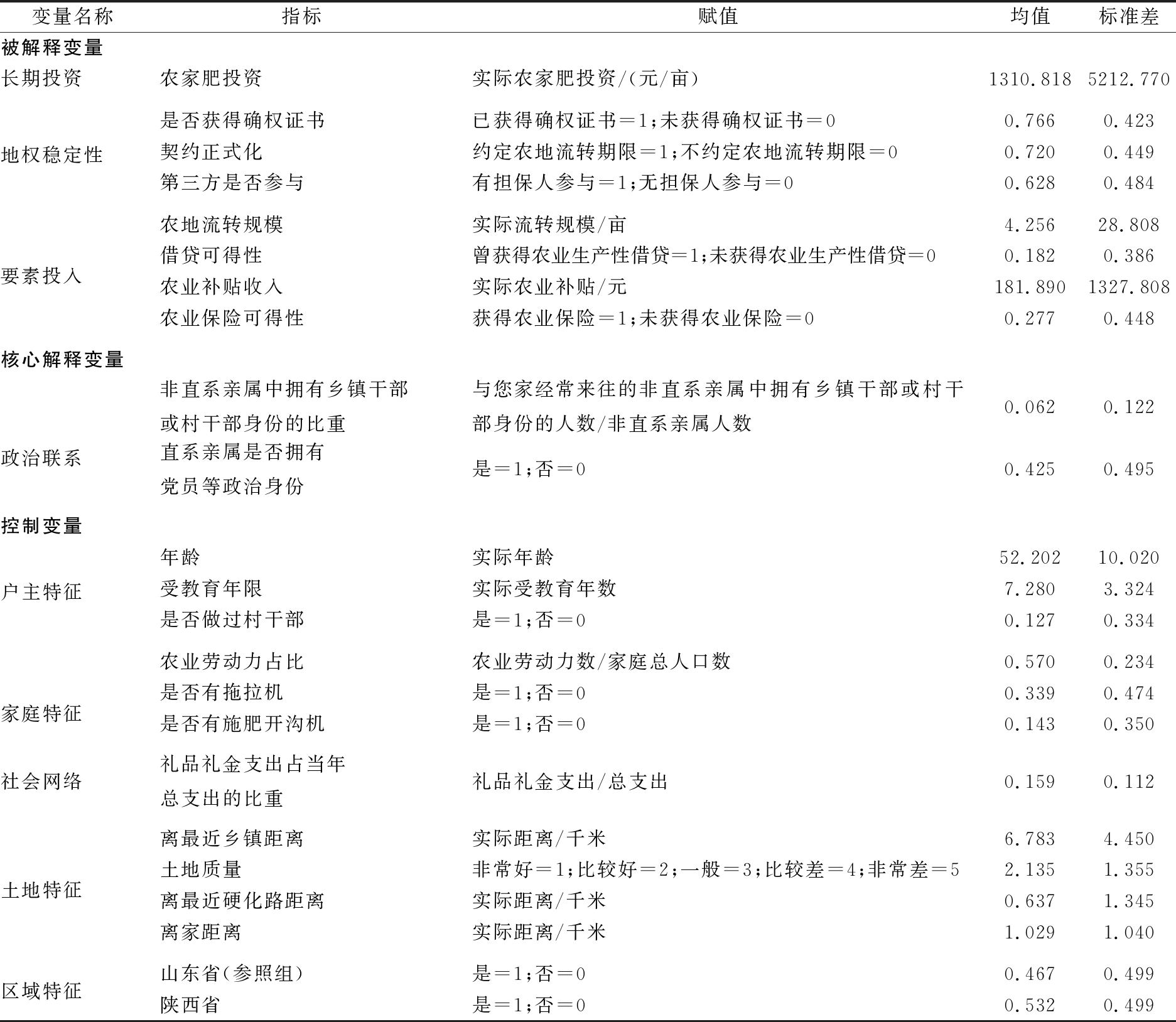 变量名称指标赋值均值标准差被解释变量长期投资农家肥投资实际农家肥投资/(元/亩)1310.8185212.770地权稳定性是否获得确权证书已获得确权证书=1;未获得确权证书=00.7660.423契约正式化约定农地流转期限=1;不约定农地流转期限=00.7200.449第三方是否参与有担保人参与=1;无担保人参与=00.6280.484要素投入农地流转规模实际流转规模/亩4.25628.808借贷可得性曾获得农业生产性借贷=1;未获得农业生产性借贷=00.1820.386农业补贴收入实际农业补贴/元181.8901327.808农业保险可得性获得农业保险=1;未获得农业保险=00.2770.448核心解释变量政治联系非直系亲属中拥有乡镇干部或村干部身份的比重与您家经常来往的非直系亲属中拥有乡镇干部或村干部身份的人数/非直系亲属人数0.0620.122直系亲属是否拥有党员等政治身份是=1;否=00.4250.495控制变量户主特征年龄实际年龄52.20210.020受教育年限实际受教育年数7.2803.324是否做过村干部是=1;否=00.1270.334家庭特征农业劳动力占比农业劳动力数/家庭总人口数0.5700.234是否有拖拉机是=1;否=00.3390.474是否有施肥开沟机是=1;否=00.1430.350社会网络礼品礼金支出占当年总支出的比重礼品礼金支出/总支出0.1590.112土地特征离最近乡镇距离实际距离/千米6.7834.450土地质量非常好=1;比较好=2;一般=3;比较差=4;非常差=52.1351.355离最近硬化路距离实际距离/千米0.6371.345离家距离实际距离/千米1.0291.040区域特征山东省(参照组)是=1;否=00.4670.499陕西省是=1;否=00.5320.499