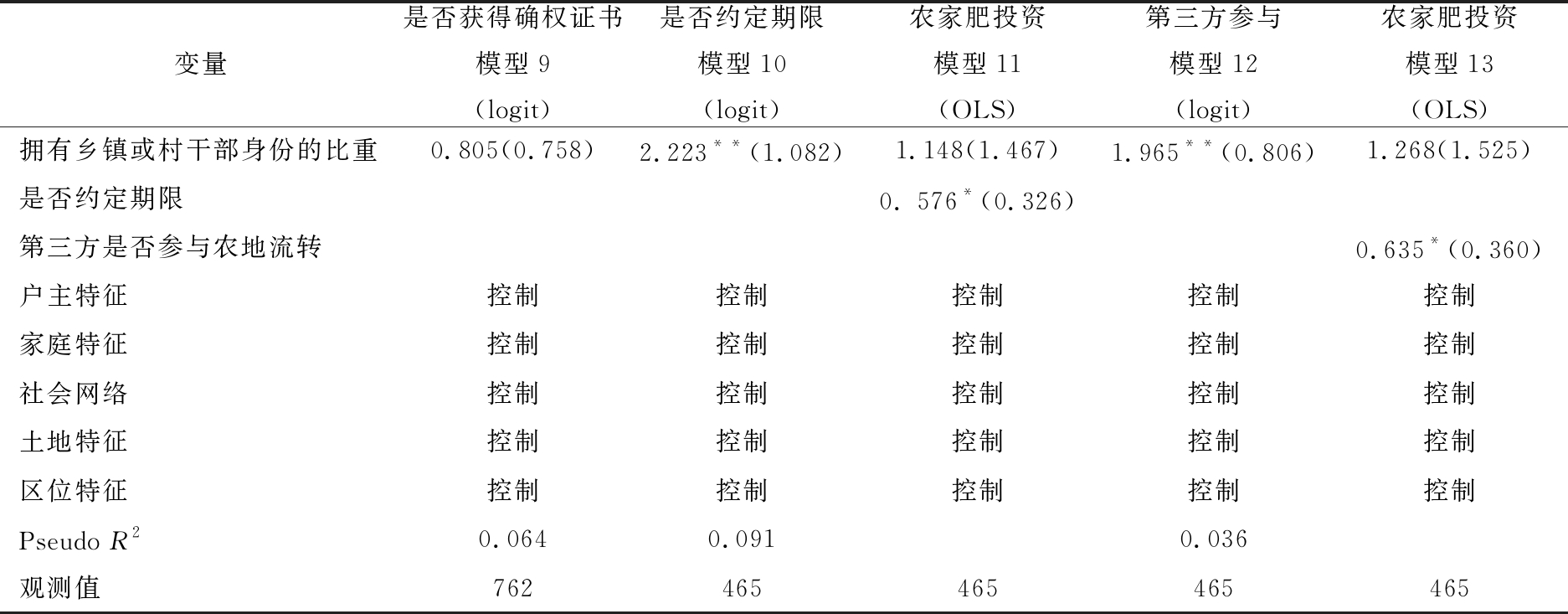 变量是否获得确权证书模型9(logit)是否约定期限模型10(logit)农家肥投资模型11(OLS)第三方参与模型12(logit)农家肥投资模型13(OLS)拥有乡镇或村干部身份的比重0.805(0.758)2.223**(1.082)1.148(1.467)1.965**(0.806)1.268(1.525)是否约定期限0. 576*(0.326)第三方是否参与农地流转0.635*(0.360)户主特征控制控制控制控制控制家庭特征控制控制控制控制控制社会网络控制控制控制控制控制土地特征控制控制控制控制控制区位特征控制控制控制控制控制Pseudo R20.0640.0910.036观测值762465465465465
