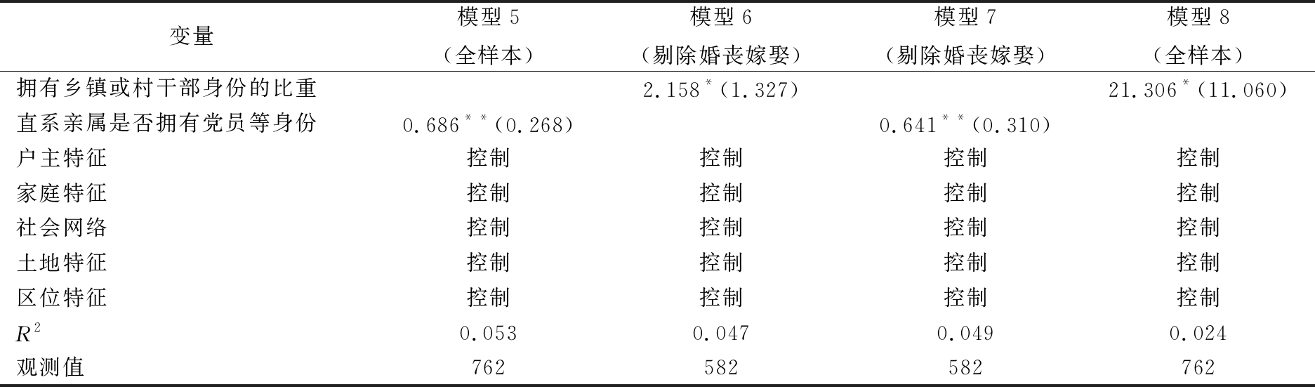 变量模型5(全样本)模型6(剔除婚丧嫁娶)模型7(剔除婚丧嫁娶)模型8(全样本)拥有乡镇或村干部身份的比重2.158*(1.327)21.306*(11.060)直系亲属是否拥有党员等身份0.686**(0.268)0.641**(0.310)户主特征控制控制控制控制家庭特征控制控制控制控制社会网络控制控制控制控制土地特征控制控制控制控制区位特征控制控制控制控制R20.0530.0470.0490.024观测值762582582762
