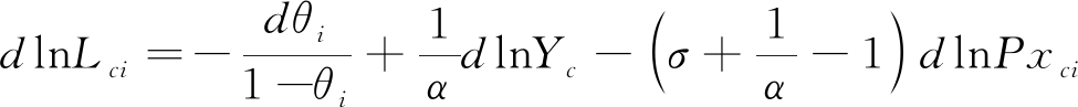在式(1)中,L为产业就业总量,i、c分别为地区、产业,i=1,…,n;θ为人工智能可以完成的工作量占比,0<θ≤1;α为人工智能投入的资本量占比,0<α<1;Y为产业c的产品总量,且