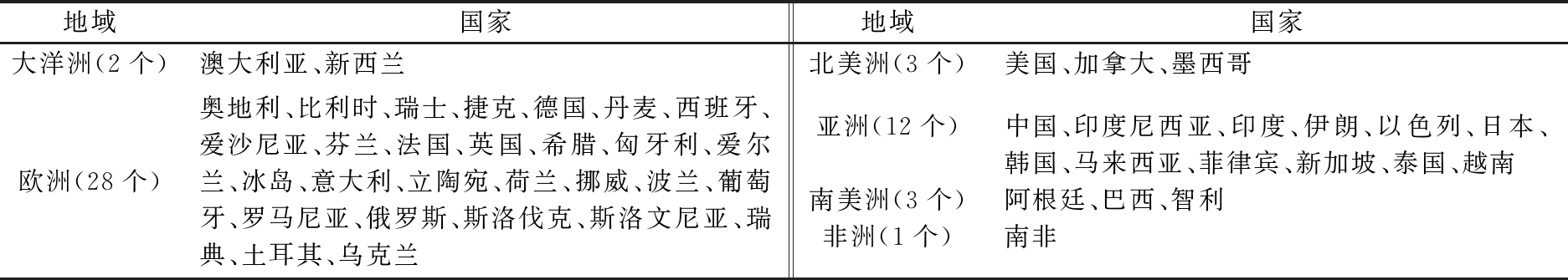 本文采用世界银行和国际机器人联合会(IFR)的数据,主要是因为世界银行数据库在国别层面统计口径一致、具有较高的权威性;机器人是较为常用的人工智能衡量指标,而IFR是全球范围内有关机器人数据的最权威机构。基于数据可得性和一致性,本文选取1991年至2018年49个国家(国家的地区分布和具体名称,见表1)的数据作为样本。各变量解释说明如下: