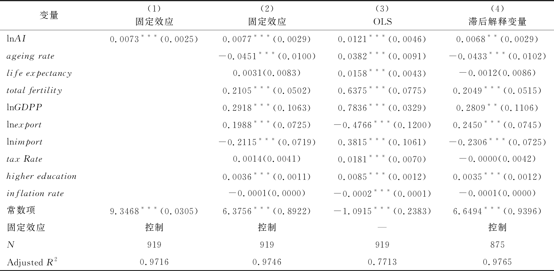 变量(1)固定效应(2)固定效应(3)OLS(4)滞后解释变量lnAI0.0073***(0.0025)0.0077***(0.0029)0.0121***(0.0046)0.0068**(0.0029)ageing rate-0.0451***(0.0100)0.0382***(0.0091)-0.0433***(0.0102)life expectancy0.0031(0.0083)0.0158***(0.0043)-0.0012(0.0086)total fertility0.2105***(0.0502)0.6375***(0.0775)0.2049***(0.0515)lnGDPP0.2918***(0.1063)0.7836***(0.0329)0.2809**(0.1106)lnexport0.1988***(0.0725)-0.4766***(0.1200)0.2450***(0.0745)lnimport-0.2115***(0.0719)0.3815***(0.1061)-0.2306***(0.0725)tax Rate0.0014(0.0041)0.0181***(0.0070)-0.0000(0.0042)higher education0.0036***(0.0011)0.0085***(0.0012)0.0035***(0.0012)inflation rate-0.0001(0.0000)-0.0002***(0.0001)-0.0001(0.0000)常数项9.3468***(0.0305)6.3756***(0.8922)-1.0915***(0.2383)6.6494***(0.9396)固定效应控制控制—控制N919919919875Adjusted R20.97160.97460.77130.9765
