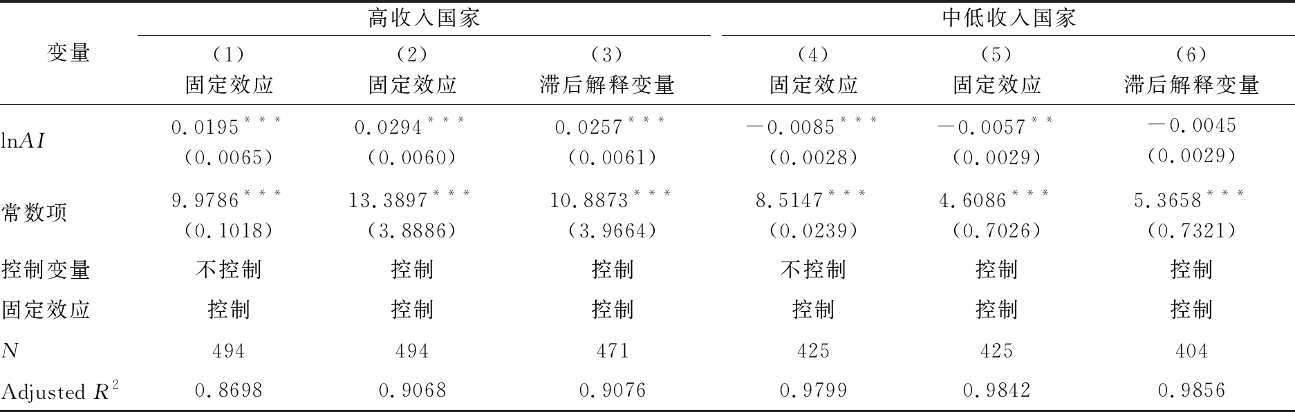 变量高收入国家(1)固定效应(2)固定效应(3)滞后解释变量中低收入国家(4)固定效应(5)固定效应(6)滞后解释变量lnAI0.0195***(0.0065)0.0294***(0.0060)0.0257***(0.0061)-0.0085***(0.0028)-0.0057**(0.0029)-0.0045(0.0029)常数项9.9786***(0.1018)13.3897***(3.8886)10.8873***(3.9664)8.5147***(0.0239)4.6086***(0.7026)5.3658***(0.7321)控制变量不控制控制控制不控制控制控制固定效应控制控制控制控制控制控制N494494471425425404Adjusted R20.86980.90680.90760.97990.98420.9856