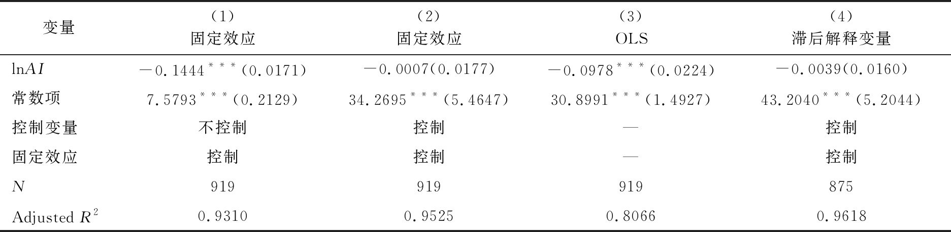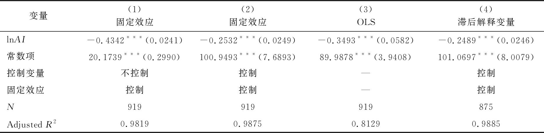 变量(1)固定效应(2)固定效应(3)OLS(4)滞后解释变量lnAI-0.4342***(0.0241)-0.2532***(0.0249)-0.3493***(0.0582)-0.2489***(0.0246)常数项20.1739***(0.2990)100.9493***(7.6893)89.9878***(3.9408)101.0697***(8.0079)控制变量不控制控制—控制固定效应控制控制—控制N919919919875Adjusted R20.98190.98750.81290.9885
