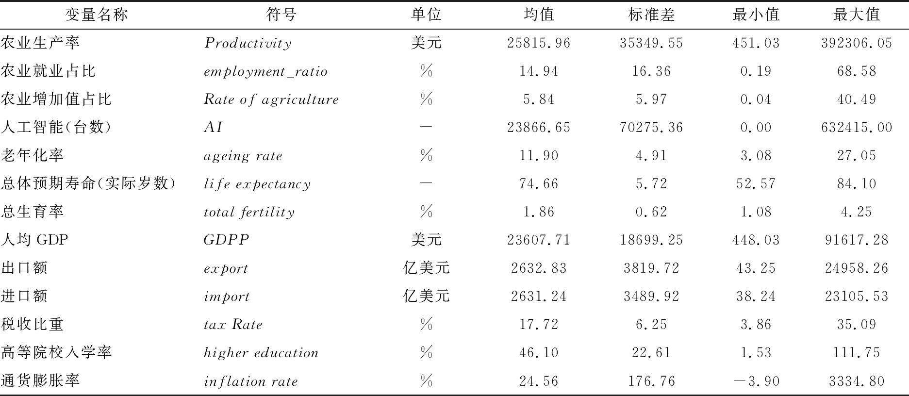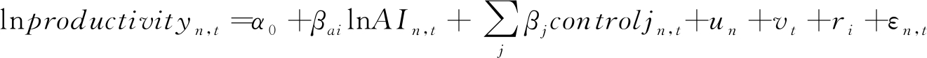 式(3)中,因变量lnproductivity为对数化农业生产率;βai为人工智能(AI)对农业生产率(productivity)的弹性系数。下标n、t、i分别表示国家、年份、所属的洲;un、vt、ri分别表示国家的个体效应、时间效应、地区效应,εn,t为误差项。结合技术进步、不均衡增长理论等理论,采用controln,t表示其他控制变量,包括老龄化率、总体预期寿命、人均GDP、货物或服务进口额、货物或服务出口额、税收比重、总生育率、高等院校入学率,βj为各控制变量的系数。