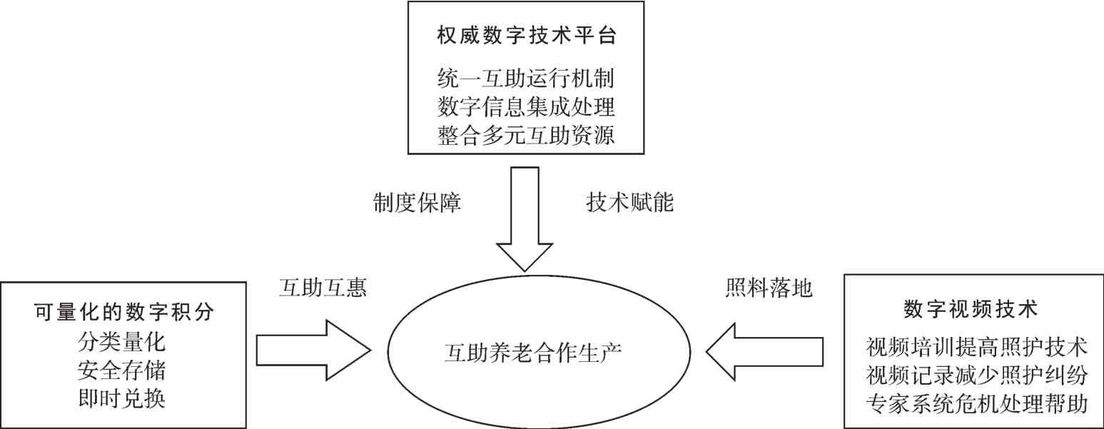 (2)数字技术赋能优化互助合作生产环境。现有学者针对性提出居家照料的互惠模式,即失能老人不离家,由周边低龄老人提供照料,并给予一定的经济报酬。这种照料方式仍然基于互助的理念。而基于数字技术治理的互助养老是在时间银行的思想上用数字技术建立一个可信赖的平台,将数字技术与互助养老深度融合,优化互助治理模式和互助合作生产环境。