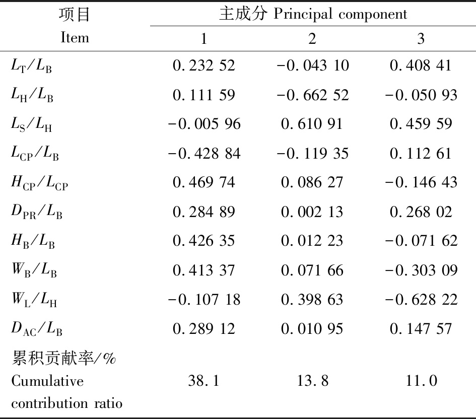 项目Item主成分 Principal component123LT/LB0.232 52-0.043 100.408 41LH/LB0.111 59-0.662 52-0.050 93LS/LH-0.005 960.610 910.459 59LCP/LB-0.428 84-0.119 350.112 61HCP/LCP0.469 740.086 27-0.146 43DPR/LB0.284 890.002 130.268 02HB/LB0.426 350.012 23-0.071 62WB/LB0.413 370.071 66-0.303 09WL/LH-0.107 180.398 63-0.628 22DAC/LB0.289 120.010 950.147 57累积贡献率/%Cumulative contribution ratio38.113.811.0