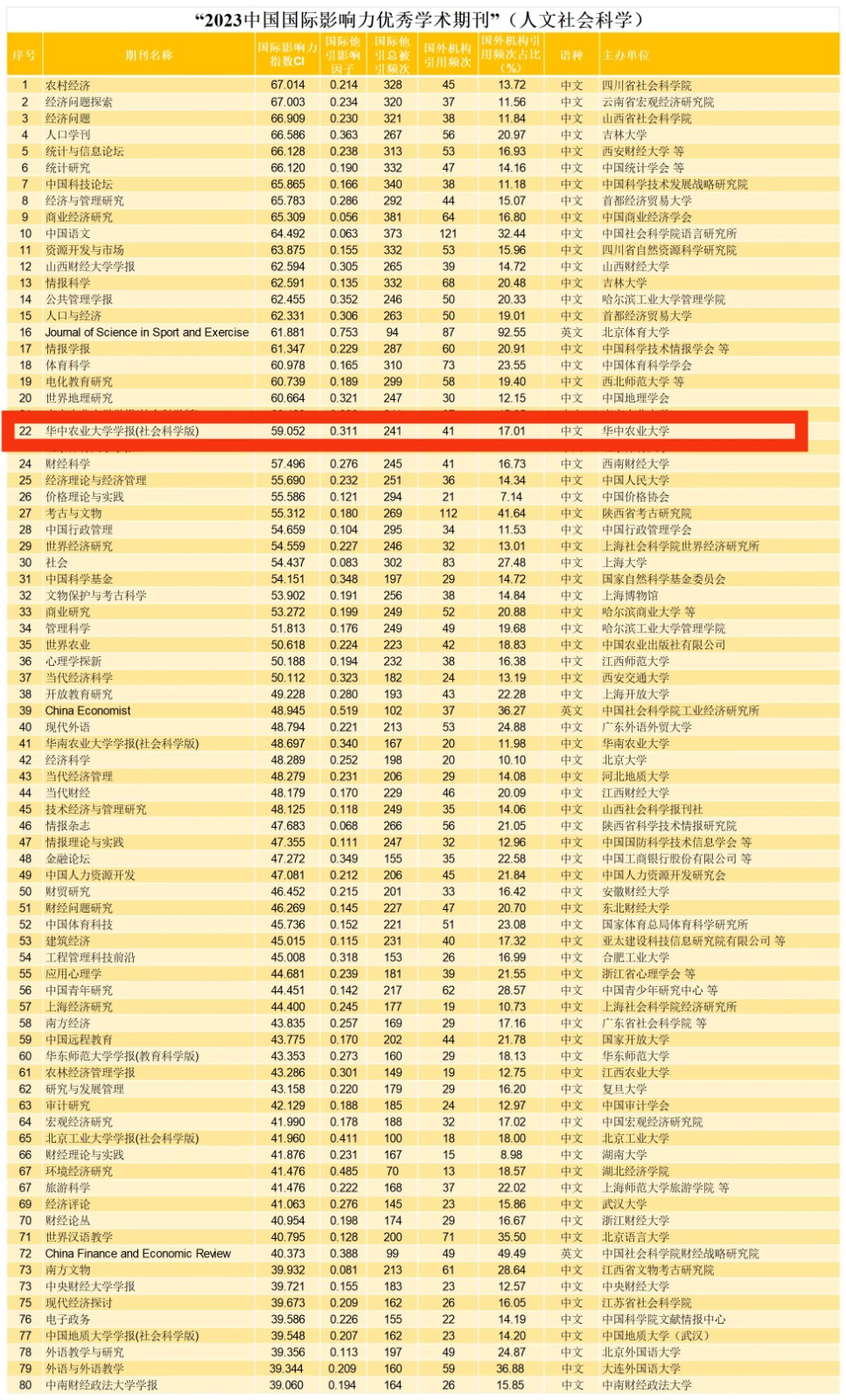 近日,知网发布“中国最具国际影响力学术期刊”和“中国国际影响力优秀学术期刊” 2023年榜单,《华中农业大学学报(社会科学版)》连续3次入选 “中国国际影响力优秀学术期刊(人文社会科学)”,全国共有80种人文社科类学术期刊入选。