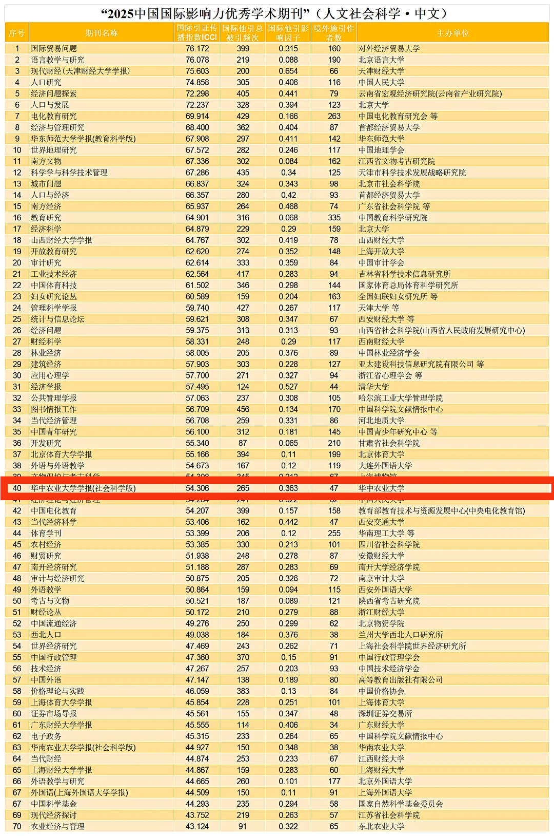 近日,知网发布“中国最具国际影响力学术期刊”和“中国国际影响力优秀学术期刊” 2025年榜单,《华中农业大学学报(社会科学版)》入选 “中国国际影响力优秀学术期刊(人文社会科学)”,全国共有70种人文社科类学术期刊入选“中国国际影响力优秀学术期刊”。2021年以来,本刊已连续5次入选“中国国际影响力优秀学术期刊”。