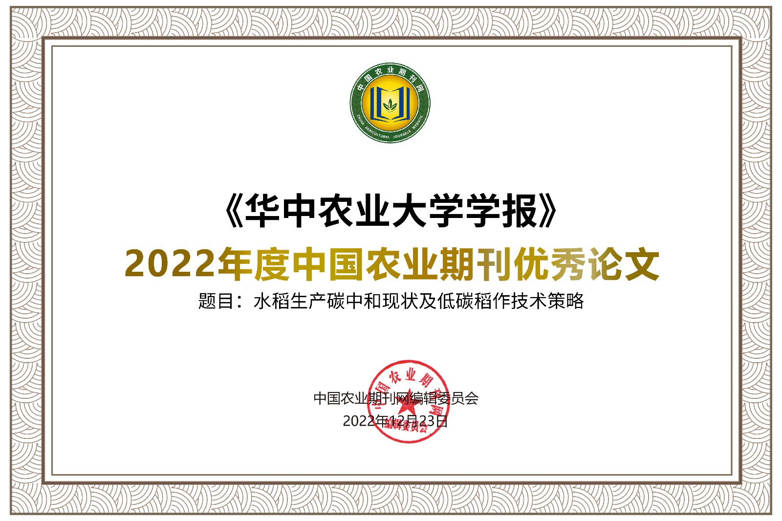 《华中农业大学学报》荣获2022年度中国农业期刊“优秀团队”等5项荣誉